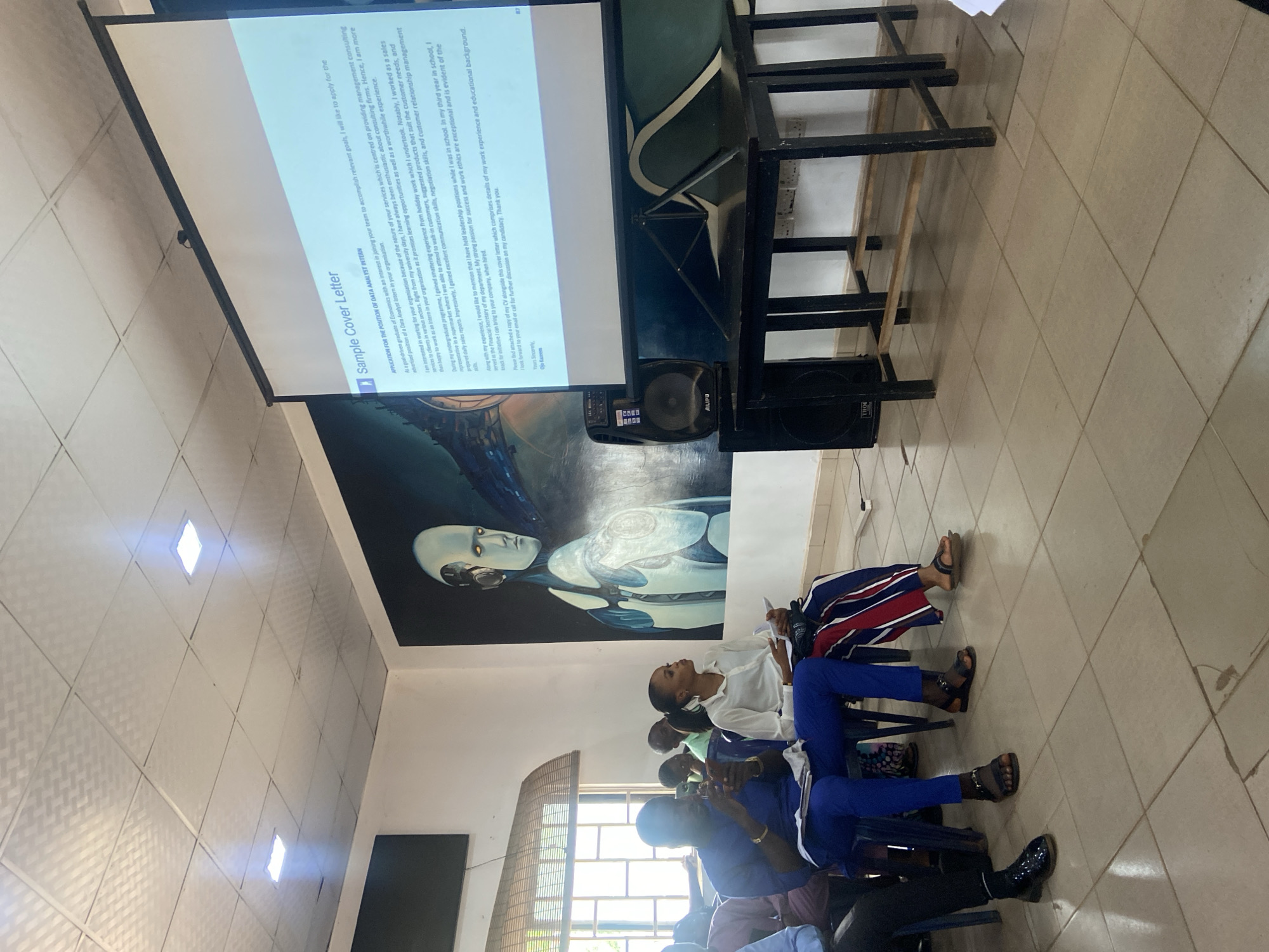 A lecture room in Nsukka, Nigeria, contains several seated people. A projector displays a document titled "Sample Cover Letter". An AIWA speaker system sits below the projector screen. A mural is visible on the wall behind the speaker system. The room has a tiled floor and drop ceiling with recessed lights.