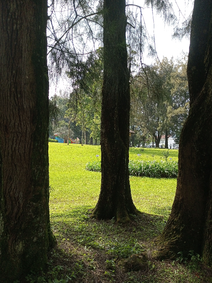 This image captures a park scene in New Serchhip, India, framed by three prominent tree trunks in the foreground