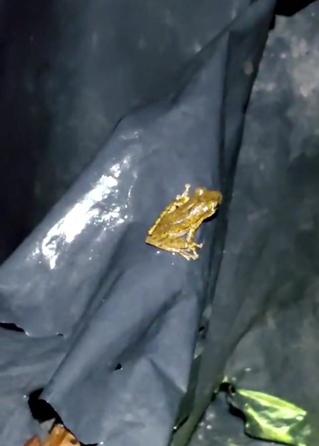 A small brown frog is perched on a sheet of black plastic