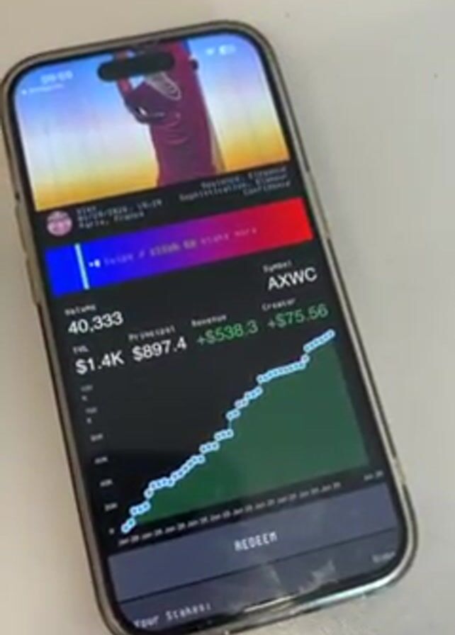 n iPhone on a white surface, displaying an app with financial data including volume, TVL, principal, revenue, and a chart with an upward trend. The app's interface includes "Redeem" and "Stake" buttons. The phone case is silver. The time displayed on the phone screen is 09:59. The app has the symbol "AXWC" in its interface. The phone is stationary.