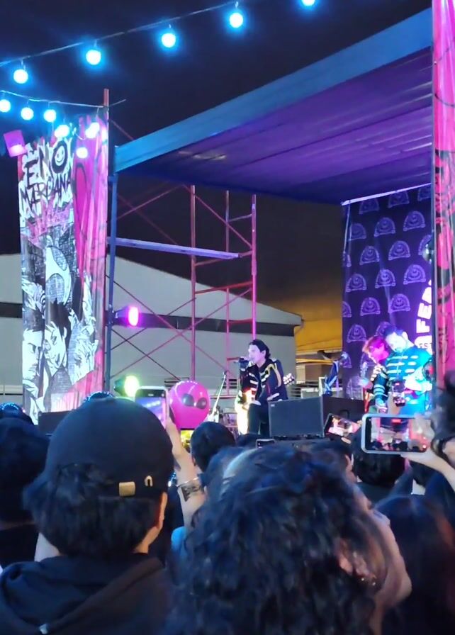 crowd of people at an outdoor concert at night. The band, ENO MERCÍANA, is performing on a stage lit with blue and pink lights. Many people in the crowd are recording the performance with their phones. There are strings of lights overhead and a building visible in the background.