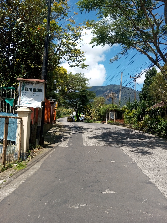 The image depicts an upward-sloping paved road in the city of Bagochen Boolingpang Ueling, Bhutan, under a clear blue sky with scattered white clouds. The asphalt road surface exhibits lighter gray patches and cracks, with visible shadows cast across its right side. On the immediate left, a light blue and white metal fence connects to a beige pillar, behind which a dark utility pole stands. Attached to this pole is a white rectangular banner displaying "VILLA ALBA" in dark lettering, with smaller text below, and a small green pennant hanging beneath it. Beyond the banner, an orange-toned wall or fence is partially visible, leading to dense green foliage and trees that line the left side of the road. Further up the road on the left, a yellow vehicle, possibly a small car or auto-rickshaw, is visible in the distance, appearing to navigate a left turn. Adjacent to it, a white and blue scooter or motorcycle is partially obscured by vegetation. The right side of the road is bordered by lush green bushes, trees, and other tropical-looking plants, including what appears to be a landscaped entrance or structure further along. Overhead, multiple black utility lines traverse the sky, supported by two visible utility poles on the right. In the background, a large green mountain range rises under the sunny sky. No individuals are visible or engaged in any discernible actions within the frame.