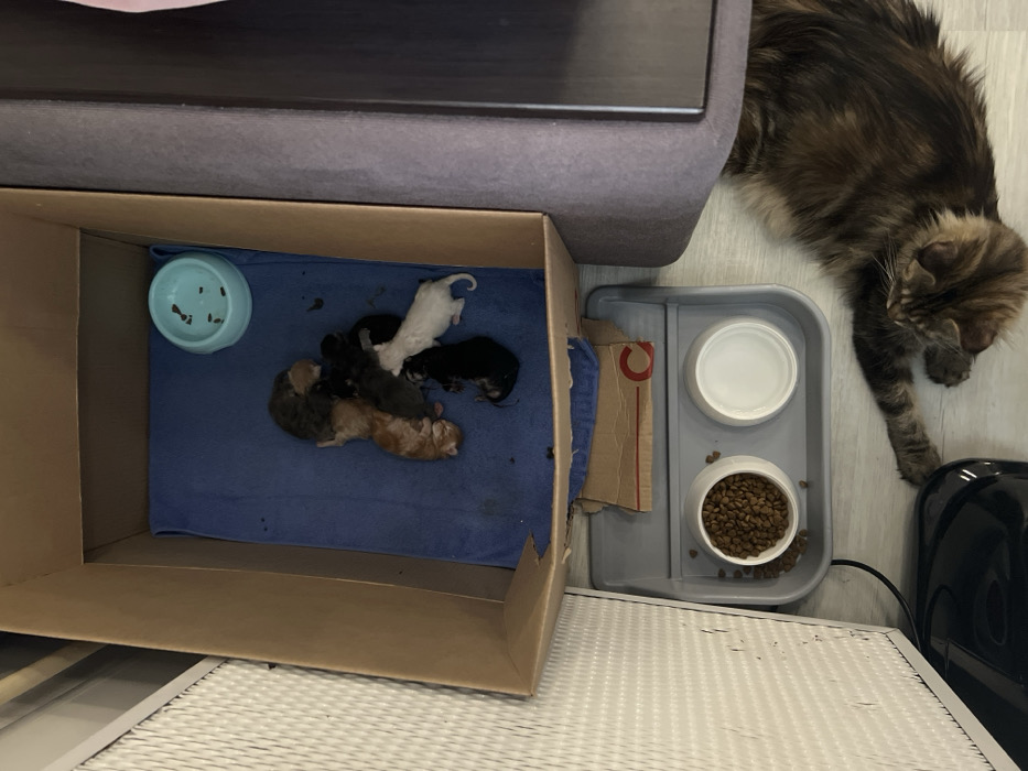This indoor scene, located in Rusanovo, Russia, depicts a feline family. A brown cardboard box, serving as a makeshift den, occupies the upper portion of the frame. Inside, a blue towel covers the bottom, upon which seven newborn kittens are huddled together. The kittens display varying fur colors, including white, black, orange, and mottled gray-brown. A small, light blue bowl containing traces of dry kibble rests near the kittens inside the box. Directly below the box, on a light-colored floor, a gray plastic tray holds two white bowls; one is filled with dry pet food, and the other appears to contain water. A crumpled piece of cardboard is also on this tray. To the bottom right, a large, adult tabby cat with brown, black, and ginger fur lies on the floor, facing away from the viewer, with its head partially visible. Its body extends beneath dark upholstered furniture to the right. A dark electronic device and a white textured panel are visible on the left side of the frame, indicating a domestic setting.