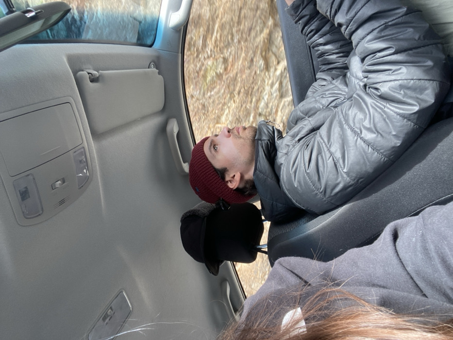 - "Inside a car, a person wearing a maroon beanie and gray puffer jacket looks upwards" by FM-uji6n1, licensed under CC BY 4.0