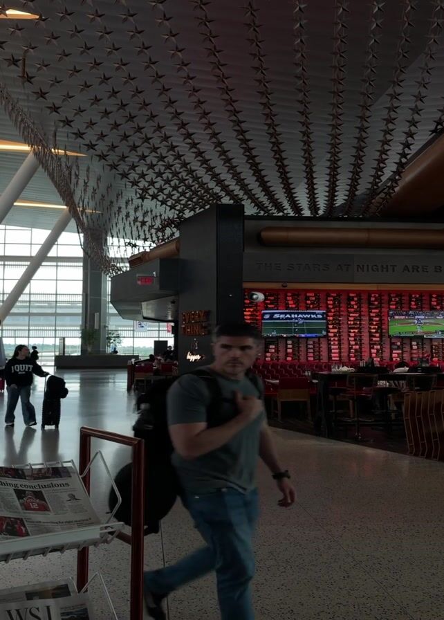 interior of an airport terminal. The ceiling is decorated with a dense pattern of metallic stars. On the right, there's a restaurant with the words "THE STARS AT NIGHT ARE BIG" written above its entrance. Inside, the restaurant is decorated with red leather booths and has televisions displaying a Seattle Seahawks football game. People are walking through the terminal, some with luggage. A newspaper stand is visible on the left. The floor is shiny and appears to be made of polished stone. The scene is well-lit by natural light coming through the large windows.