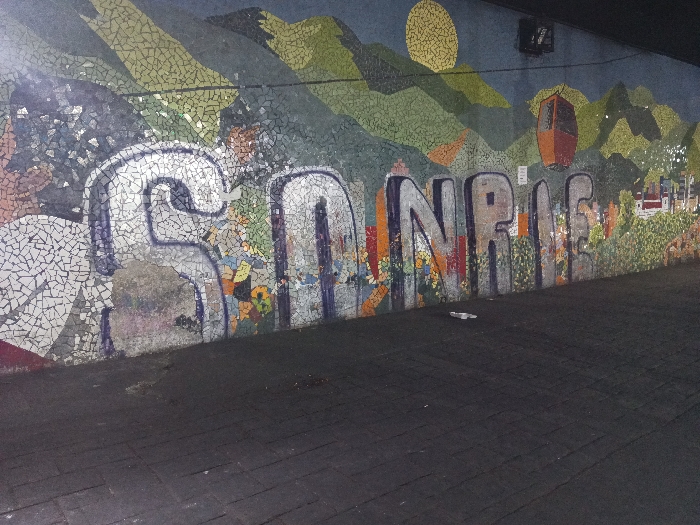 The scene depicts a large, outdoor mosaic mural on a wall, observed at night under artificial illumination. The mural illustrates a stylized mountainous landscape, featuring varied green and brown terrain, a prominent yellow circular mosaic representing the sun or moon, and an orange, distinctively shaped cable car cabin. Lush green foliage and small white and red architectural structures, indicative of a town or settlement, are visible in the lower-right portion of the mural. Large, silver-outlined bubble letters spelling the Spanish word "SONRIE" (SMILE) are spray-painted across the lower-center of the mosaic, partially obscuring the original artwork. The ground in the immediate foreground is a dark, paved surface, possibly composed of cobblestones or dark pavers, exhibiting minor wear. A few small, white pieces of debris are scattered on this surface near the base of the mural. The depiction of El Ávila mountain and its teleférico places this mural within the city of Caracas, Venezuela, likely in a public underpass or along a main thoroughfare. No individuals are present.