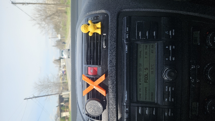 A daytime image taken from the interior of a vehicle, looking forward through the windshield. The vehicle's dark, textured dashboard occupies the lower half of the frame. Attached to the central air vents are three items: a circular black object with white markings on the left, a bright orange 'X'-shaped object in the center, and a small yellow smiling humanoid figure on the right. A red triangular hazard light button is visible between the orange 'X' and the yellow figure. Below the dashboard items, a SkodaAuto brand car radio and infotainment system displays green text, including "FM-AS 13:10", "KANAL 77", "FOOL'S", "18.5 °C", and "87.50". Additional climate controls below the radio show "OFF". Through the windshield, a paved road stretches into the distance under a clear, light blue sky. A white SUV is observed driving away from the viewer in the mid-distance. On the right side of the road, a solitary individual, appearing as a blurred figure, walks away from the camera. The roadside environment includes bare deciduous trees and several wooden utility poles with overhead wires. Low-rise buildings are visible along the left side of the road in the background. This scene is located in the city of Gevgelija, North Macedonia.