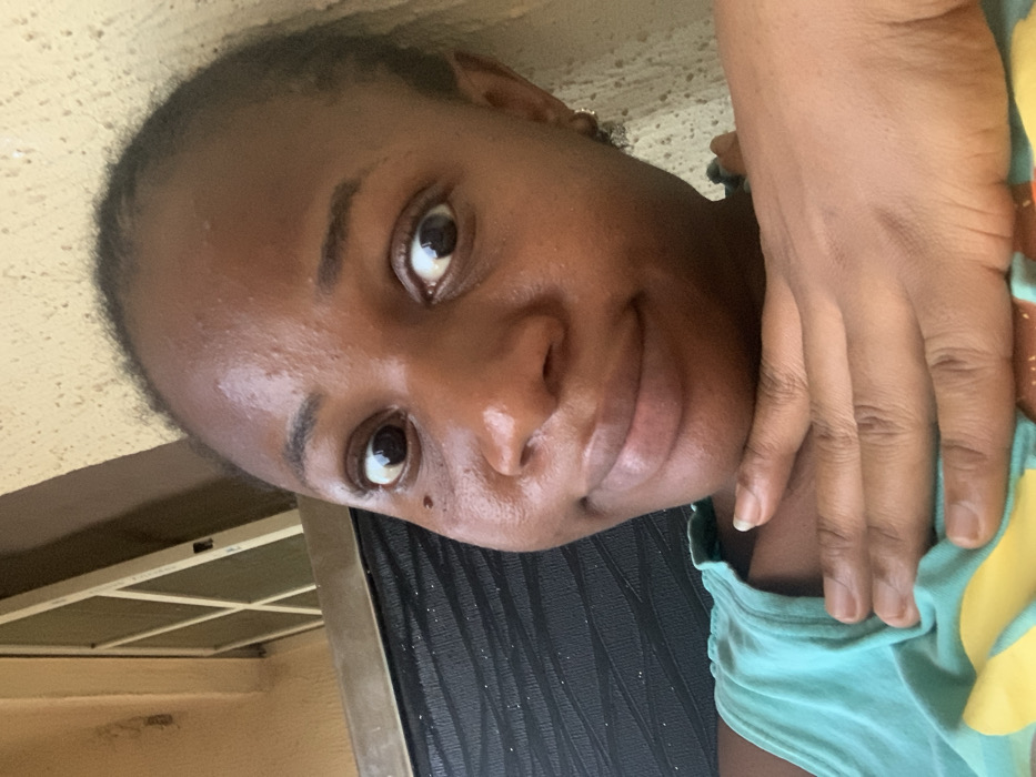 A close-up of a woman with dark skin and brown eyes, looking directly at the camera. Her hair is pulled back, and she's wearing a light blue top with a yellow pattern. Her hand is positioned near her neck. The background is slightly out of focus, revealing a wall and a door.