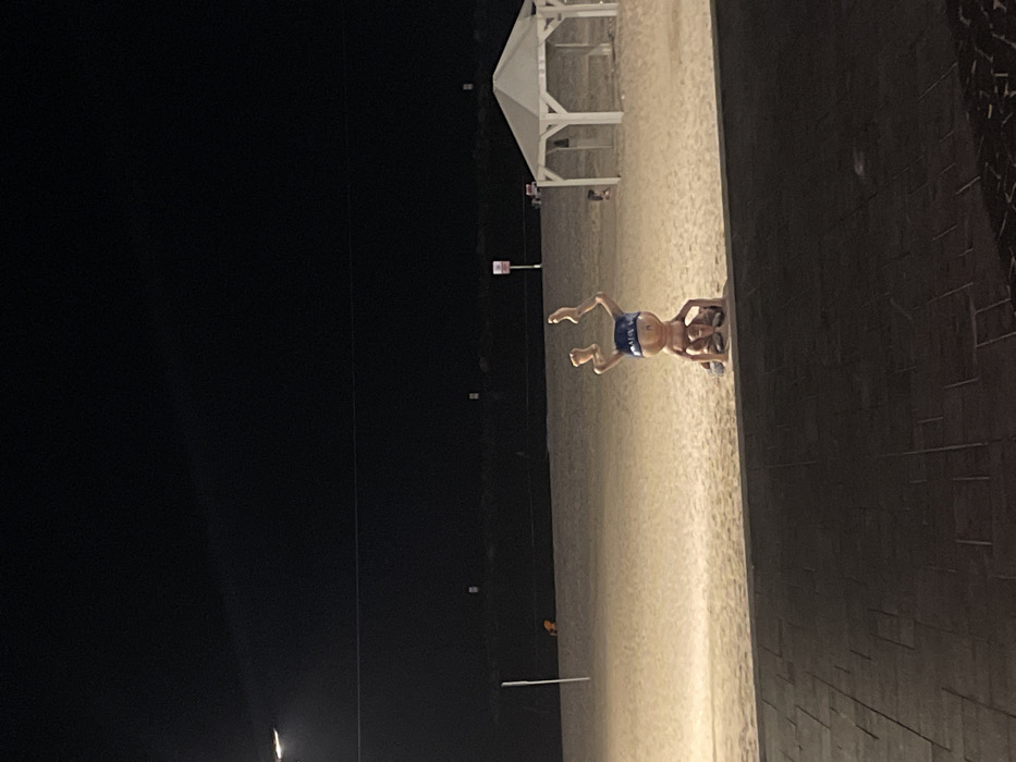 The image displays a nighttime scene on the Tel Aviv promenade, near Bograshov Beach, Tel Aviv, Israel. In the center, on the illuminated sandy beach, stands the "Bathing Beach" sculpture by David Popiashvili, depicting a stylized human figure performing a handstand, with its legs raised and blue shorts visible. The figure's "head" rests on a textured base. To the left of the sculpture, a white pole, likely for beach volleyball, is planted in the sand. To the right, a white, open-sided gazebo with a square roof stands on the beach. The immediate foreground shows a dark, patterned paved area, suggesting a promenade or walkway, partially illuminated. The background features the dark expanse of the sea under a night sky, with faint distant lights visible along the horizon. Artificial lighting illuminates the beach and the sculpture, creating a warm glow against the dark surroundings. No individuals are visibly present near the central sculpture or prominent in the scene.