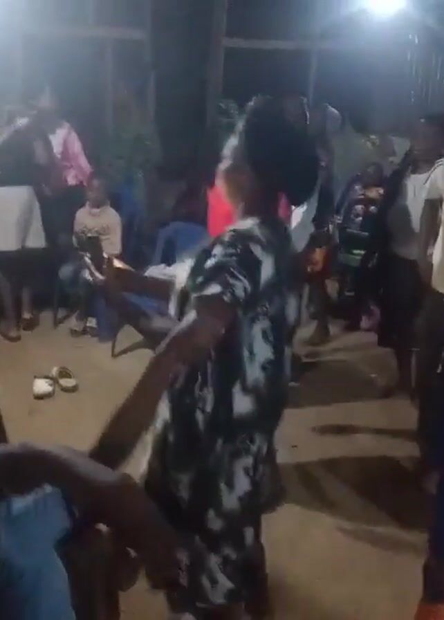 group of people dancing inside what appears to be a house or hall, possibly at a party or celebration. The lighting is dim, with a bright light source illuminating parts of the room. Several adults are dancing, some wearing colorful outfits or head coverings. A few children are also present, some sitting and observing. One person is holding up a phone, possibly recording the event. The environment is somewhat cluttered with chairs and other objects. There is a general sense of activity and merriment.
