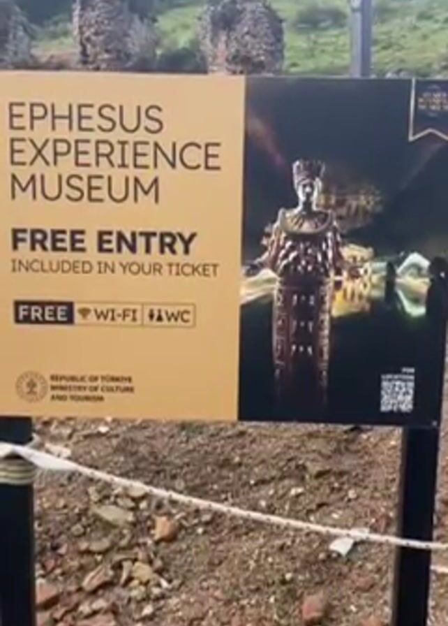 The camera is static, focusing on a sign that reads "Ephesus Experience Museum: Free Entry Included in your Ticket