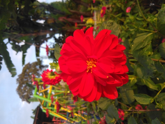 - "The image displays a close-up, front-facing view of a vibrant red dahlia flower positioned in the center foreground, within a garden setting in the city of Paktho, Laos" by FM-oHfK92, licensed under CC BY 4.0