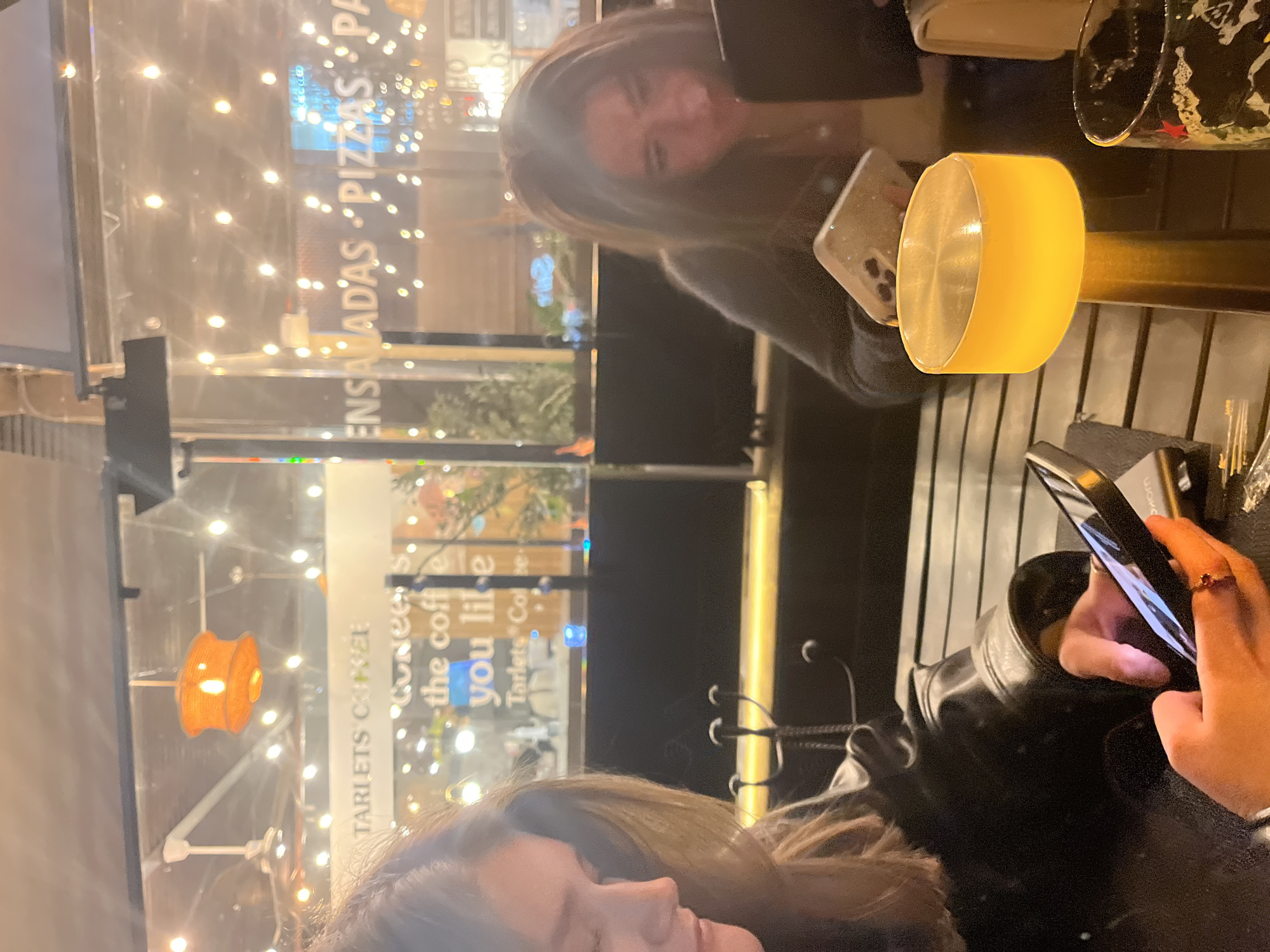 The image depicts an indoor dining scene with two individuals at a table. One person is holding and looking at a mobile phone, which has a black case. Their hand is visible, adorned with a ring. Next to them is a table lamp with a cylindrical shape, emitting a warm yellow light. The adjacent person is holding a different mobile phone with a glittered case. The image is captured in a restaurant with outdoor views that provide the context that this scene took place in San Bernardino Tlaxcalancingo, Mexico. The view includes lit-up signs for "TARLETS COFFEE," indicating a café or coffee shop, and "ENSALADAS PIZZAS PA," likely advertising salads and pizzas. String lights illuminate the scene, creating a cozy and casual atmosphere. The people and the subjects are interacting over the table while viewing their mobile devices.