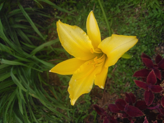 The image displays a close-up, high-angle view of a single, fully bloomed yellow flower, consistent with a daylily type, situated in Phou Khoun, Laos. The flower is centrally positioned in the upper portion of the frame, presenting six distinct yellow petals, some exhibiting minor creases and faint venation. Yellow anthers containing pollen and associated stigmas are visible within the flower's core. In the lower left foreground, a cluster of out-of-focus dark red or burgundy leaves, appearing velvety in texture, is present. The background consists of blurred green foliage, characterized by long, blade-like leaves in the upper half and a short green ground cover with visible patches of dark soil in the lower half. The scene is illuminated by natural, diffused daylight. No individuals or artificial objects are discernible within the frame.