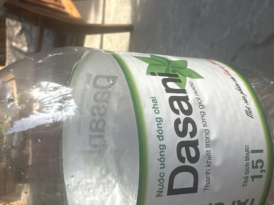 - "A 1.5-liter Dasani brand clear plastic water bottle, partially filled and exhibiting condensation droplets, occupies the foreground. Its white label features green top and bottom borders, displaying Vietnamese text including "Nước uống đóng chai" (Bottled drinking water), "Dasani" with a green leaf motif integrated into the 'i', "Thanh khiết trong từng giọt nước" (Pure in every drop of water), and "Thể tích thực: 1,5 L" (Net volume: 1.5 L). A partial phrase, "Một sản phẩm của Coca-Cola," is also visible. The bottle's upper portion reflects distorted images of outdoor foliage, likely palm trees. The background, out of focus, reveals a portion of a dark wooden chair with a patterned, light-colored cushion to the right, situated on a light-colored outdoor surface, possibly concrete or tile. The scene is illuminated by bright daylight. No people or specific actions are depicted. This outdoor or semi-outdoor setting is located within Thành phố Phan Thiết, Vietnam, as indicated by the Vietnamese language on the product label." by FM-S4vcm1, licensed under CC BY 4.0
