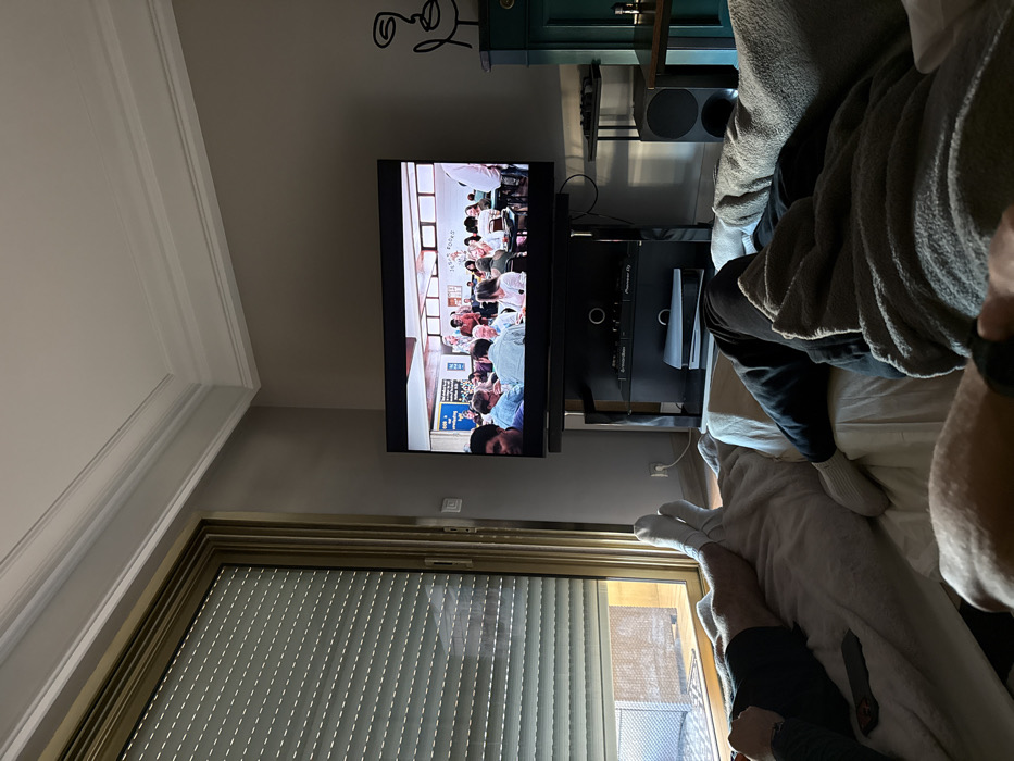 The image depicts an indoor scene in a residential dwelling located in Cannes, France, focused on two individuals relaxing and watching television. In the foreground, the lower bodies of two people are visible, reclining on a surface covered with white and grey blankets, presumably a sofa or bed. The person on the left wears dark shorts and white socks, with their legs extended towards a large window. A mobile phone lies near their left hand. The person on the right wears dark sweatpants and white socks, with their legs also extended and partially covered by a grey blanket. Dominating the center-right of the frame is a large, wall-mounted flat-screen television displaying a scene featuring multiple people seated at tables in what appears to be a communal dining area or cafeteria. A sign with partially visible text, including "Jeux Po...", is discernible in the background of the television screen. The television is positioned above a black, multi-tiered media console. On the console's upper shelf, a Pioneer DJ controller (model DDJ-FLX4) is visible, and on the lower shelf, a white PlayStation 5 console is present. To the right of the media console, a black subwoofer or speaker rests on the floor next to a dark, small side table. Further right, a dark teal-colored cabinet or chest is visible, topped with a minimalist black wire sculpture depicting a human face. On the left side of the image, a large window with a metallic, possibly gold-toned, frame is prominently featured. An external horizontal slatted roller shutter (volet roulant) is mostly closed over the window, allowing a narrow strip of daylight to enter from the bottom. Through this opening, a section of an outdoor tiled surface, likely a balcony or terrace, with a metal railing, is partially visible. The interior walls are painted a light taupe or grey, contrasting with white crown molding along the ceiling. The overall lighting suggests ambient natural light filtering into the room.