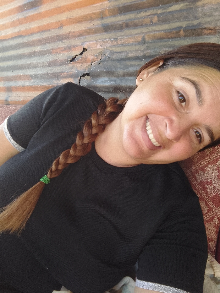 A woman smiles towards the viewer. She is fair-skinned with brown eyes. Her hair is brown and braided, held with a green band. She wears a black t-shirt with white trim on the sleeves. She rests against a patterned red fabric. The background is a corrugated metal wall with some damage visible. Her expression is relaxed and joyful.