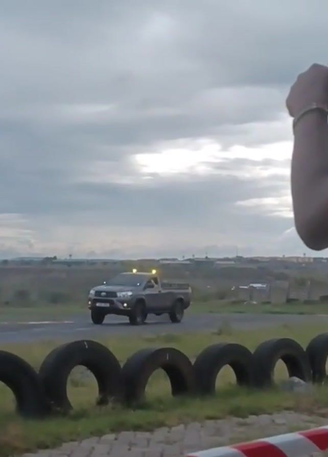 A gray pickup truck drifts on an overcast day. The truck drives from right to left in the frame, surrounded by tires marking an enclosed race track. The track is a paved road surrounded by grass and a sparse treeline in the distance. A person's arm, possibly taking video, is visible on the right.