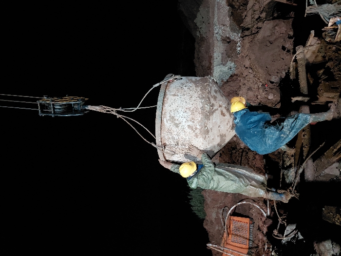 Two workers wearing yellow helmets and rain gear labor in a dark construction site. A large, dirty concrete bucket hangs suspended by cables and a pulley system. The workers are positioned near the bucket, seemingly guiding or manipulating it. The ground is muddy and cluttered with tools and equipment. A section of soil or embankment is visible in the background. The overall scene conveys a sense of arduous work under challenging conditions.