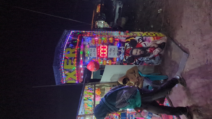 A "BOXER" arcade machine with flashing lights displays a score of "000." The machine features images of wrestlers. Two people stand nearby, one wearing a brown jacket and another in a blue hoodie. The surrounding area is dark and appears to be an outdoor setting.