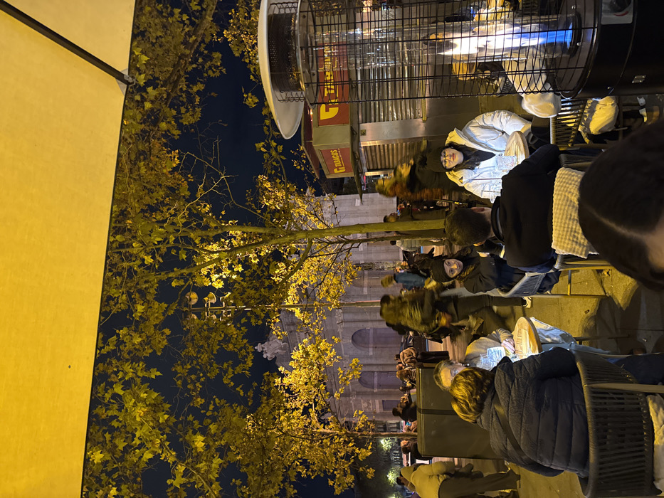 Outdoor cafe scene at night. Several people sit at tables, enjoying food and drinks. Overhead heaters provide warmth. A building with illuminated architecture is visible in the background, framed by trees with golden leaves, perhaps due to autumn or the lighting. A "Tabacos" sign is also visible.