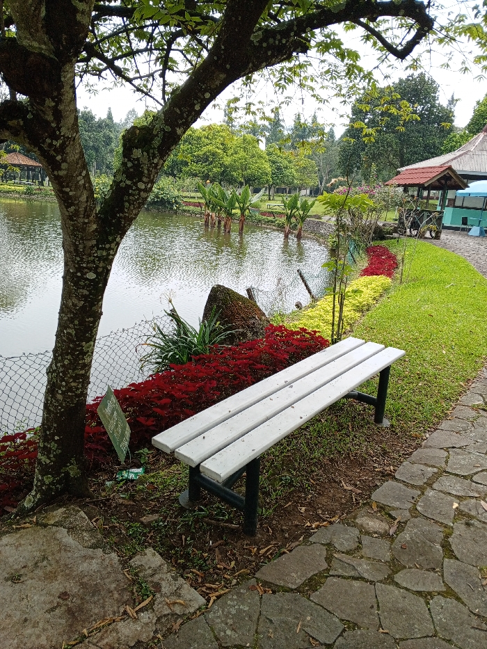 A serene landscape showcases a gray bench on a stone-paved path, bordered by lush green grass and a vibrant array of red and yellow flowers. A tranquil lake is viewed through a tree trunk and a wire fence, mirroring the surrounding greenery. A gazebo and various trees line the lake's edge, completing the picturesque scene.