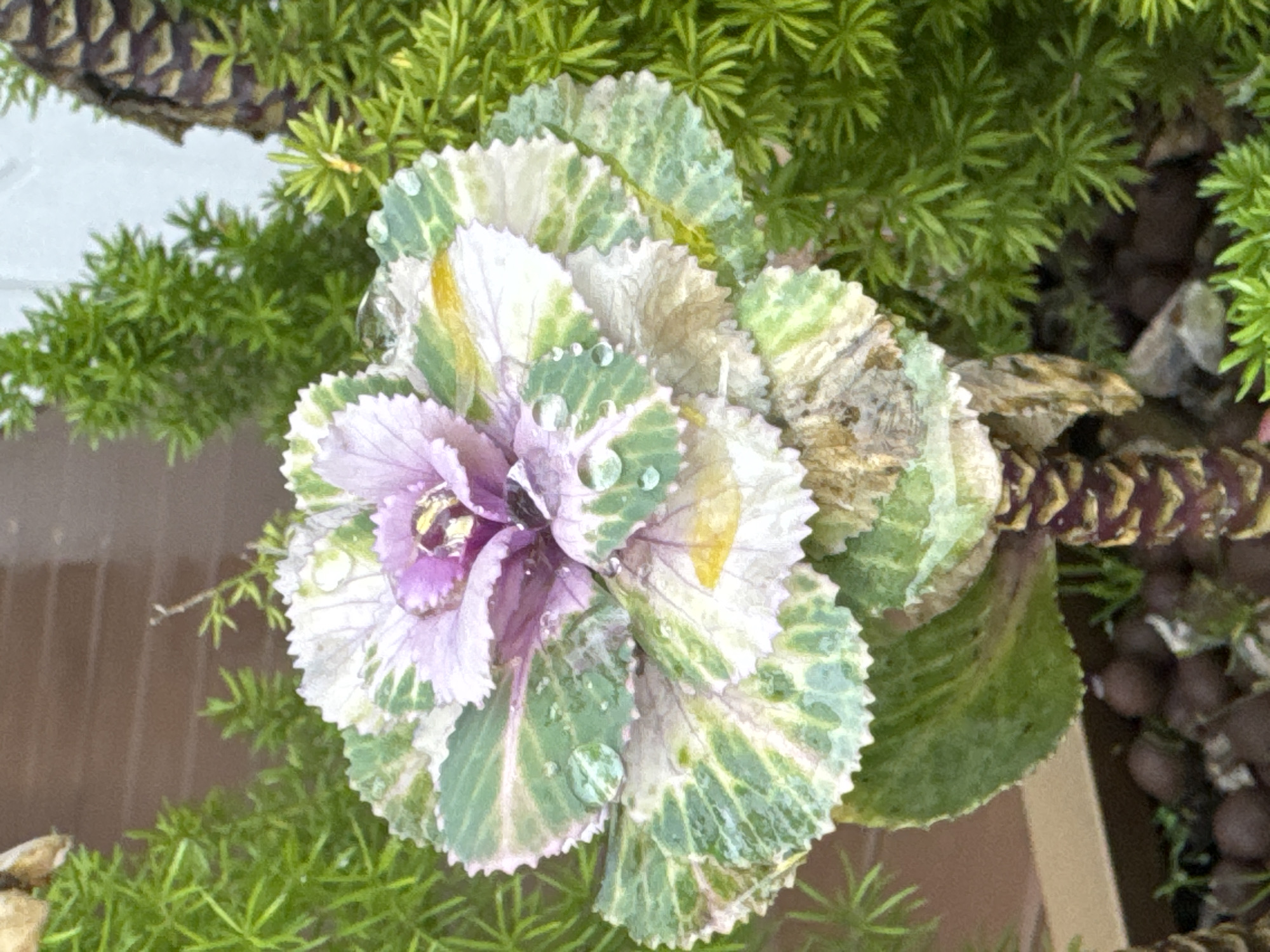 The image displays a close-up view of a single ornamental cabbage (Brassica oleracea var. acephala) plant, situated in Zhangjiajie, China. The plant is centered, exhibiting variegated leaves with a purplish-pink inner core, transitioning outwards to white, cream, and then green coloration on the ruffled, serrated edges. Numerous small, clear water droplets are visible on the surface of the leaves. The plant's stem, visible at the base, is thick and displays alternating purplish-brown and light brown segments. Below the plant, dark brown, spherical objects, resembling soil pellets or decorative pebbles, are visible within a container. Lush, vibrant green, needle-like foliage, consistent with an asparagus fern, frames the central plant on both the left and right sides. The upper-left background features a blurry, horizontal, light brown surface, while the upper-right background shows a dark, textured vertical element against a lighter, indistinct area. No individuals or other distinct human-made objects are present in the scene apart from the plant and its immediate container environment.