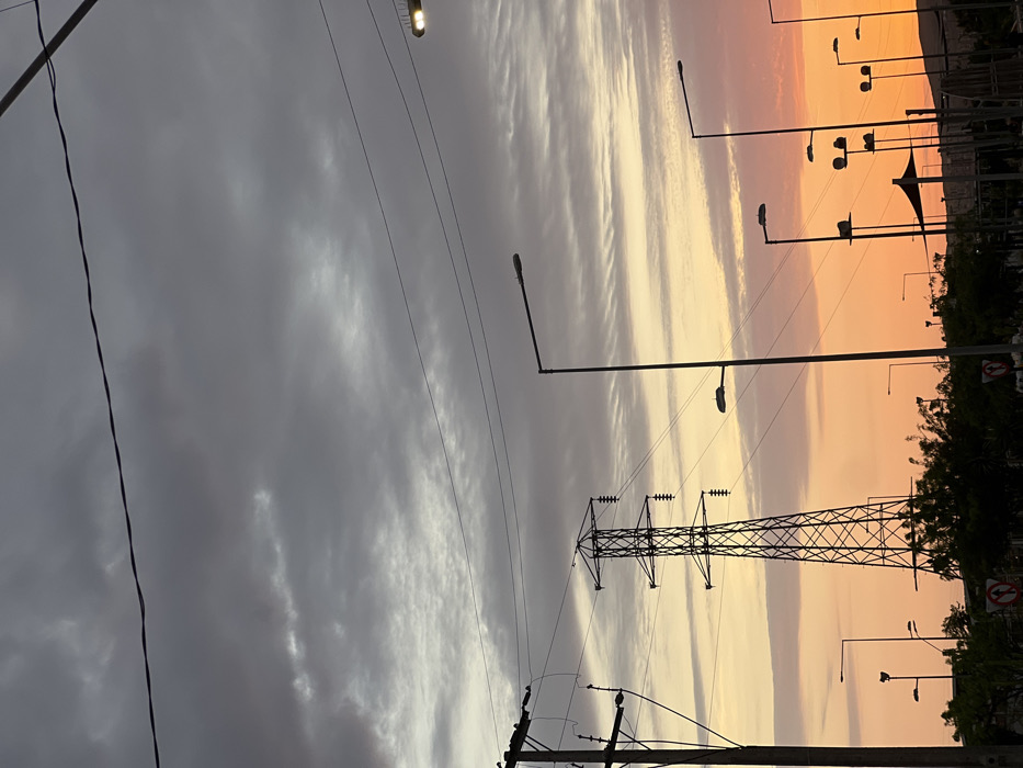 The image depicts a twilight scene with a sky divided into gray clouds on one side and an orange-tinted sunset on the other. The scene is dominated by power lines and streetlights. An electrical transmission tower stands prominently in the middle ground, and trees line the lower right edge. The composition is shot from a low angle, emphasizing the height of the structures and the vastness of the sky.