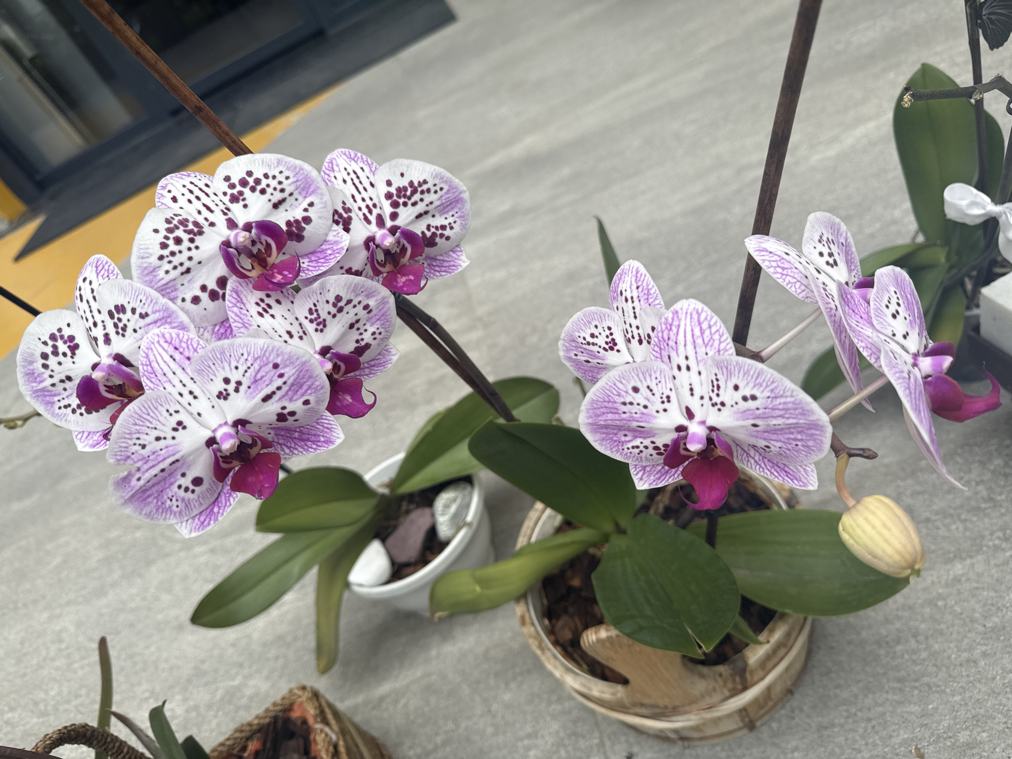 This image displays two potted Phalaenopsis orchid plants positioned on a light grey concrete or tiled surface in Alanya, Turkey. The primary orchid in the foreground exhibits a main stem bearing seven open flowers and a prominent, elongated yellow-green bud. Each flower presents white petals accented with distinct purple-magenta speckles and a deep purple-magenta central labellum. This plant resides in a light brown, textured pot, likely ceramic or woven, with visible bark substrate. A secondary orchid is situated in the mid-ground, showcasing four similar white and purple-speckled blooms and contained within a white, circular pot that includes substrate and small decorative white and purple stones. A partial view of a third woven pot is visible in the upper-left corner. The background consists of blurred architectural elements, including a dark grey or black window frame and a yellow-orange wall panel. The scene is illuminated by natural light.
