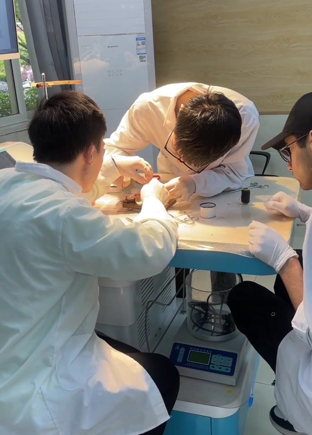 Three individuals wearing white lab coats and gloves are gathered around a light blue, wheeled table. One person is leaning over the table, working with tools on an object, while the other two watch. Various instruments, including scissors and spools of thread, are visible on the table. There is a device with a digital display on the bottom shelf of the table. A computer screen is visible to the left, and an air conditioning unit is in the background.