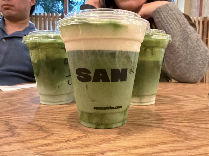 Three clear plastic cups filled with matcha drinks rest on a wooden table. The central cup is the largest and bears the logo "SAN さん" in black letters. A white layer sits atop the green matcha in each cup. Two people are partially visible in the background; one wears a blue shirt, the other a gray sweater. The background is blurred, showing wooden elements and hints of foliage.