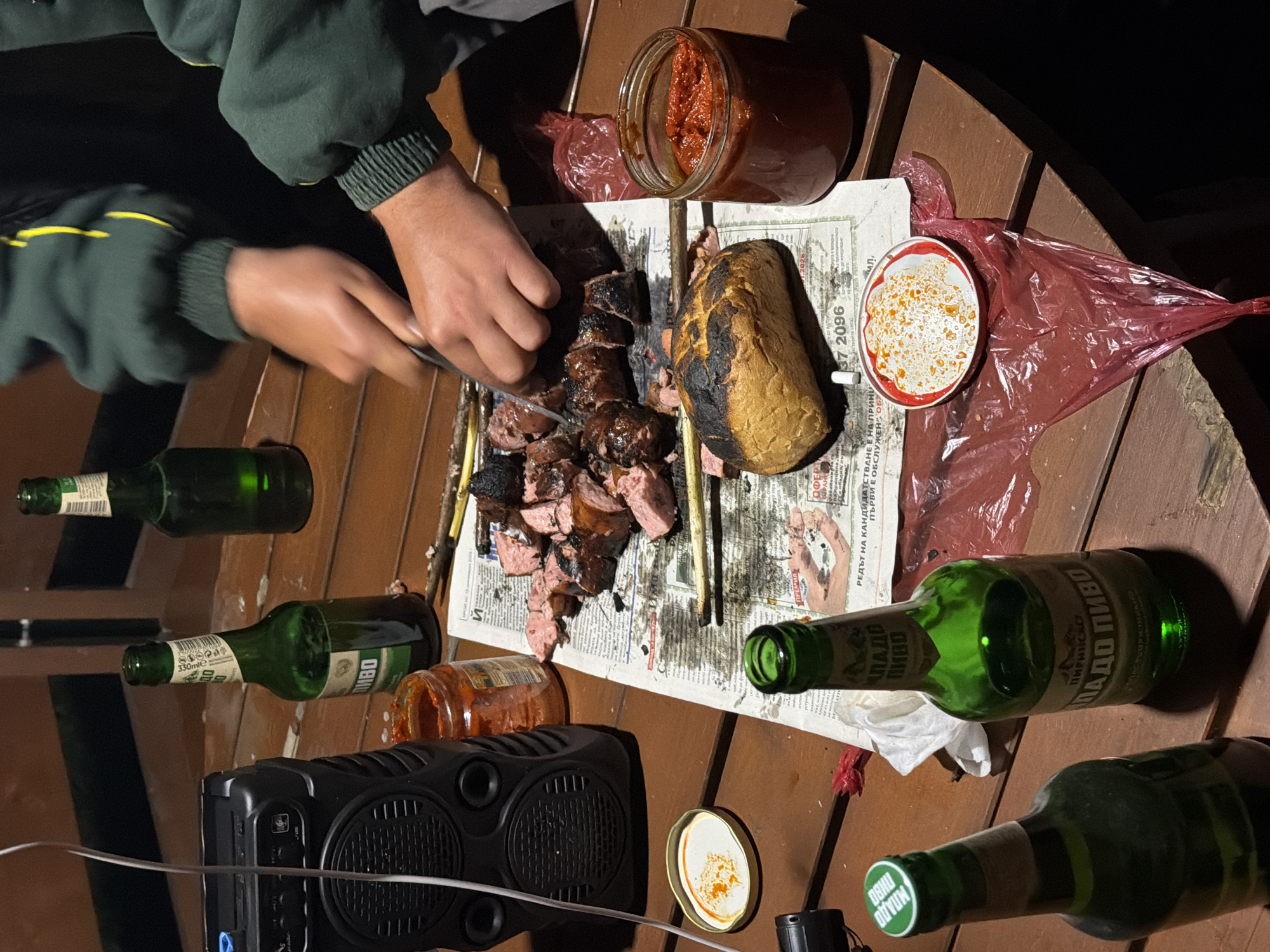 The scene depicts an outdoor or rustic indoor gathering on a wooden table surface in Tutrakantsi, Bulgaria, under low light conditions. The primary subject is a person's hands and forearms, clad in a dark green jacket with yellow piping, actively slicing cooked meat (identified as sausage-like links and larger chunks, some well-done, some pink) with a knife. The meat rests on a spread-out Bulgarian newspaper dated "18 декември 2021 г." (December 18, 2021). Adjacent to the meat is a slightly charred, oval-shaped loaf of bread. Various objects are arranged on the table: * A black portable Bluetooth speaker is positioned on the left, with a white cable extending upwards. * Multiple green glass bottles of "ПИРИНСКО ЛАДО ПИВО" (Pirinško Lado Pivo - Pirin Beer) are scattered across the table; some are upright, one is capped, and others appear open or partially consumed. * Two glass jars containing spreads or sauces are visible. One larger, open jar on the right contains a thick, red, chunky substance, consistent with *ljutenica*. A smaller, open jar on the left contains a reddish-orange substance. * A small white ceramic dish with a red rim holds a white substance speckled with orange-red spices or oil. * A red plastic bag is crumpled on the table. * Several thin wooden sticks, possibly skewers or kindling, lie near the meat. * A crumpled white napkin and a small black object (possibly a flashlight) are also present. * The table itself is constructed from reddish-brown wooden planks.