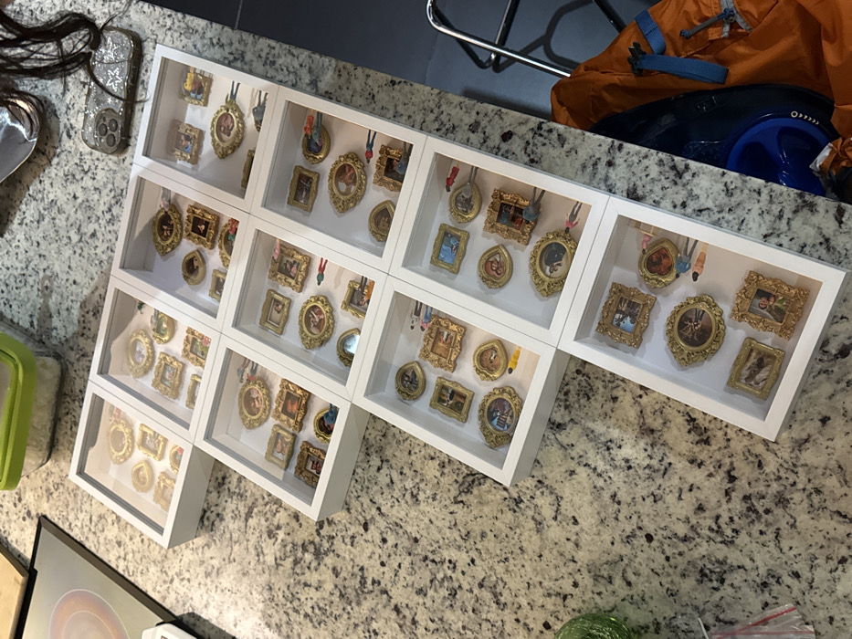 A collection of white, square shadow boxes are arranged on a speckled countertop. Each box contains an assortment of miniature, ornate picture frames with various images. Tiny figures dangle from the tops of some frames, adding a whimsical touch. A backpack and other items sit nearby, suggesting a domestic setting.