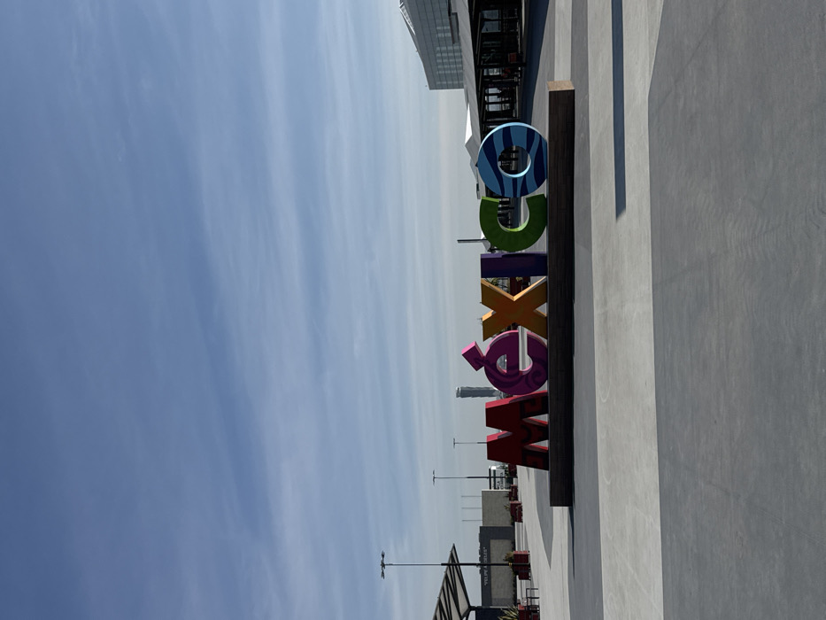 A colorful "Mexico" sign stands vertically, each letter uniquely patterned and hued