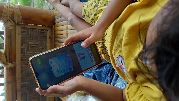 A child is holding a smartphone, playing a 3D puzzle game. The phone has a gold colored case. The game's screen displays a blue, layered object, possibly a virtual sculpture. The child is wearing a yellow top with a cartoon patch and blue shorts. They are sitting in a bamboo structure.
