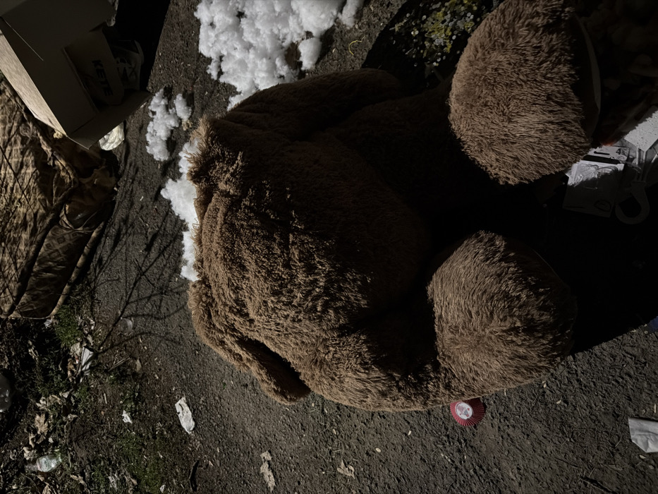 The scene depicts a refuse area in Bistritsa, Bulgaria, under localized artificial illumination, casting distinct shadows. A large, brown, fur-covered stuffed animal, appearing to be a bear, lies supine on dark, uneven ground, occupying the central foreground. White synthetic stuffing protrudes from the stuffed animal's upper torso/neck region, with additional loose stuffing scattered on the ground to its right. To the left of the stuffed animal's lower body, a red cupcake liner is visible. In the background, to the upper right, a soiled, patterned mattress rests on the ground next to a partially visible cardboard box, which displays the text "KETE." The surrounding ground is littered with various debris, including plastic bottles, crumpled white paper, and sparse patches of green grass and dry leaves. No individuals are present.