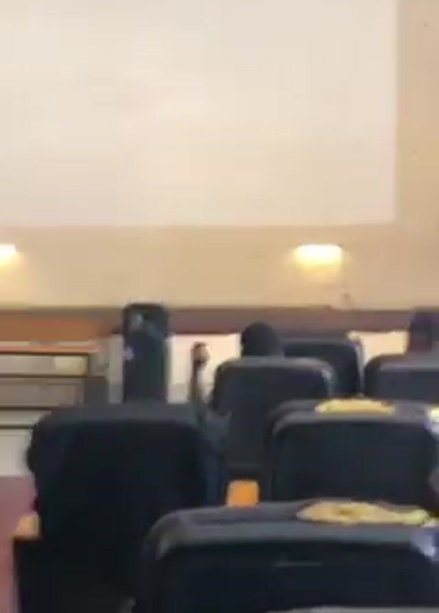 room with rows of black chairs, mostly occupied by people. A man is standing, facing the audience, and appears to be talking. He is wearing a hoodie and jeans. There is a light stand near him with a light shining toward the audience. The room has several windows that are letting in sunlight. There is a projector screen at the front of the room, though it is blank. The video is shaky and taken from the back of the room.