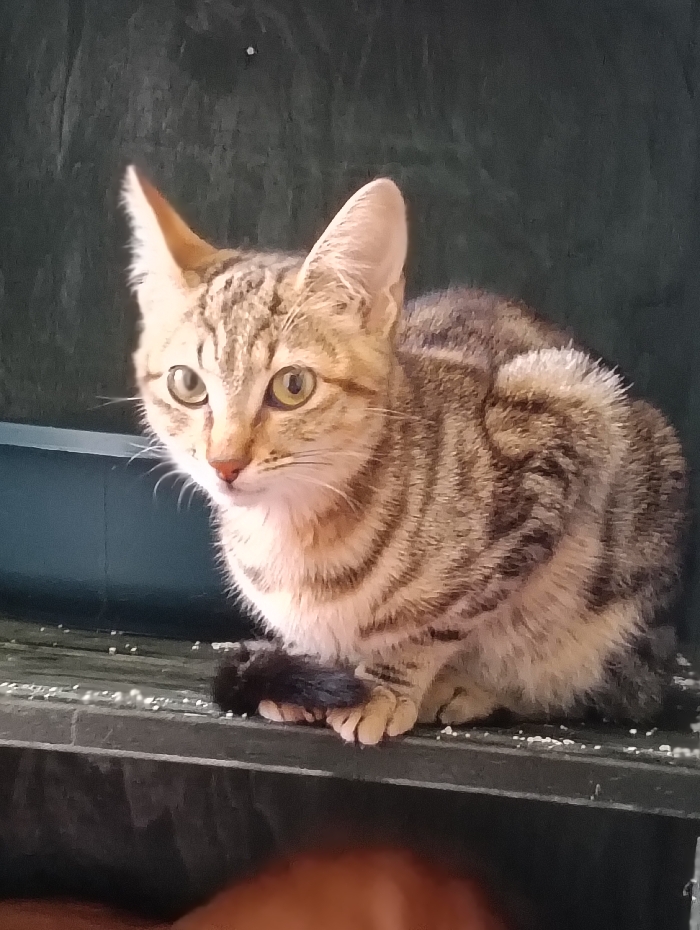 - "A domestic tabby cat, characterized by light brown fur with dark brown stripes, sits alertly on a dark, textured horizontal surface" by FM-E8rQG2, licensed under CC BY 4.0