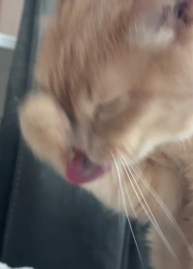 - "An orange tabby cat is grooming itself with its left paw" by FM-6DEQC3, licensed under CC BY 4.0