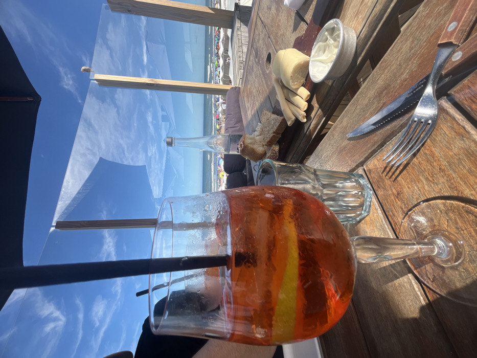 An outdoor table displays a refreshing aperol spritz with a black straw. Adjacent is a plate of bread, cheese, and a small bowl of creamy dip. A fork and knife rest nearby. The beach and ocean are visible through a glass enclosure, reflecting the blue sky with scattered clouds. A black umbrella provides shade.
