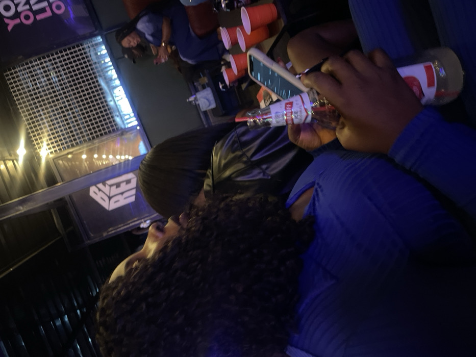 A dimly lit indoor scene features several people and drinking paraphernalia. A woman in a blue shirt and curly hair is in the foreground. Next to her, another person wears a black leather jacket. Someone holds a phone in one hand and a bottle of Smirnoff vodka in the other. Red plastic cups are stacked on a table behind them, suggesting a party or social gathering. In the background, a person wearing a backwards baseball cap is visible. The backdrop includes lit-up signs with text.