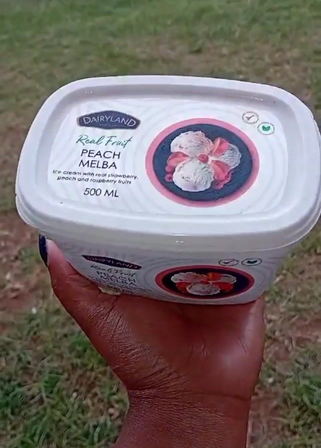 A hand with dark blue nails holds a white plastic container of "Dairyland Real Fruit Peach Melba" ice cream. The container shows an image of ice cream with strawberry, peach, and raspberry fruits. The container is 500 ml. The background is a grassy area with some crates or wooden objects visible.