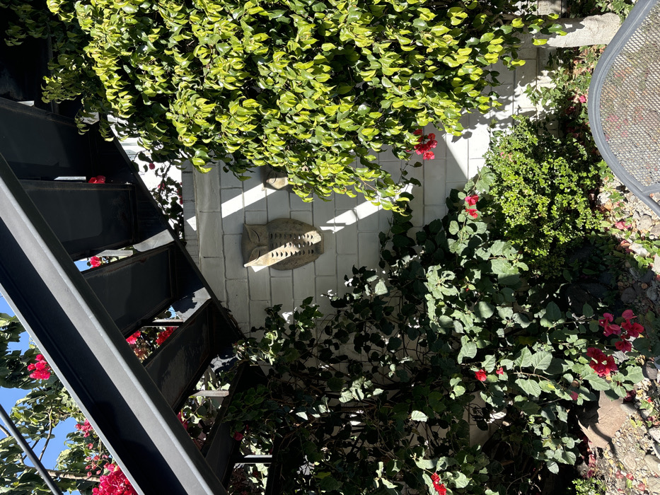 A vertical shot shows a black metal staircase ascending alongside a white brick wall. Lush green foliage and vibrant red flowers cascade around the staircase and wall. A decorative owl statue is mounted on the brick. A metal table with a mesh top sits to the right, partially visible. Sunlight casts distinct shadows across the brick, creating a bright and natural setting.
