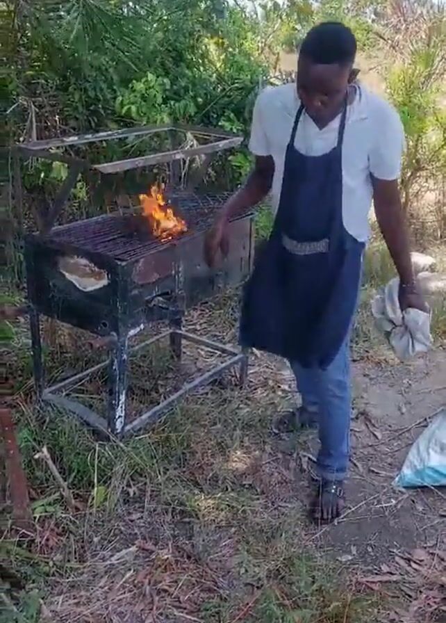 person grilling food outdoors. The person is wearing a white t-shirt, blue jeans, and a dark apron. The person is standing in front of a black grill with flames visible inside. The grill is surrounded by grass, trees, and bushes. The person uses a long stick to adjust the food on the grill. A white towel is held in their left hand.