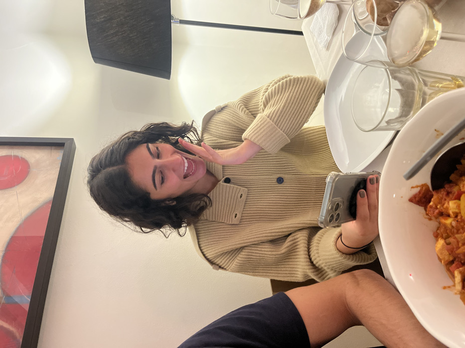 A young woman with dark, wavy hair, wearing a beige ribbed cardigan, is seated at a dining table in an indoor restaurant or home in Paris, France