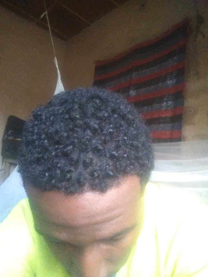 This image captures a close-up of an individual, likely male, with dark skin and closely cropped, curly black hair. The person is wearing a neon yellow or bright green collared garment and is looking downwards, with only their forehead, eyebrows, and the upper part of their eyes visible. The background consists of light brown, possibly plastered walls. In the upper left, a darker, potentially wooden ceiling section is visible, from which a white string or cord hangs vertically. On the upper right wall, a horizontally striped textile, featuring alternating bands of dark grey/black and red, is displayed. A translucent, light-colored mesh fabric, consistent with a mosquito net, is present in the lower right foreground. A dark, indistinct object is partially visible on the left side. The scene is adequately illuminated, with some brightness on the individual's clothing and the mesh. This scene is situated within a room in the city of Jos, Nigeria.