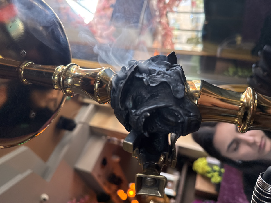 The image displays a close-up, upward-angled view of the upper portion of a brass-toned hookah stem. A prominent feature is a dark, matte, sculpted head, resembling a snarling primate or mythical creature, affixed to the stem. White smoke is actively emanating from around this sculpted head and the reflective charcoal tray positioned directly above it, signifying the hookah is in use. A horizontal, brass-colored component extends from the side of the sculpted head. The background is largely out of focus, depicting an indoor public establishment in Sofia, Bulgaria, likely a lounge or cafe. To the right, blurred reddish-orange foliage is visible through what appears to be a window, suggesting an outdoor view or decorative elements. The left side of the background reveals warm, blurred orange lights, a ceiling-mounted security camera, and a highly blurred individual with dark hair, seated and looking downwards. Further interior details include hints of yellow flowers and a purple, textured seating surface. The scene is consistent with a contemporary social venue.