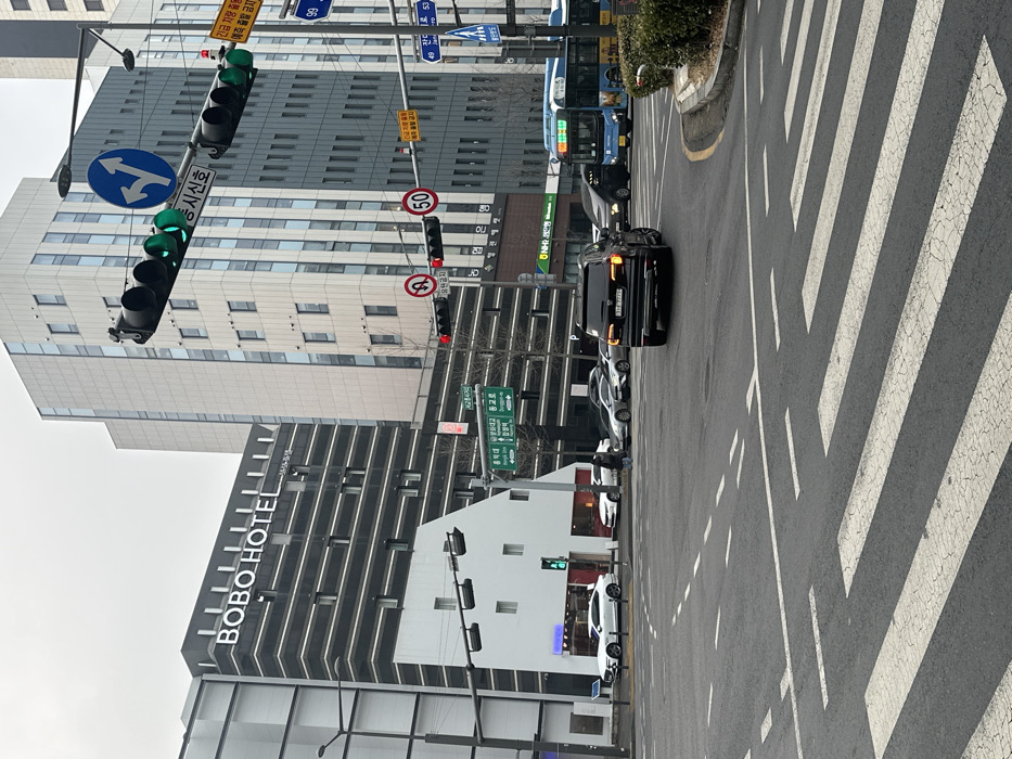 street scene in an urban setting. A tall building with "BOBO HOTEL" on its facade is visible. There's a zebra crossing on the road. Cars and a bus are driving on the street. Traffic lights display green signals. Street signs are present, indicating directions and speed limits. A sign warns against predicting the departure of emergency vehicles. There are a few buildings on the side.