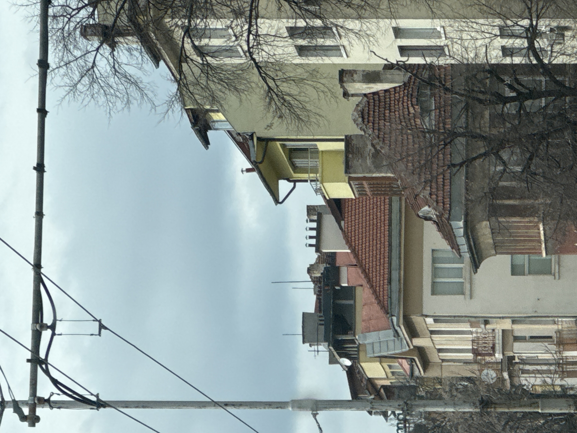 The image presents a street scene in Sofia, Bulgaria. Several multi-story buildings line the street, exhibiting a mix of architectural styles and construction materials. Some buildings have terracotta tiled roofs, while others are clad in light-colored stucco or plaster. Windows are visible on all facades, with some covered by shutters or curtains. Overhead power lines, supported by utility poles, crisscross the sky. Bare tree branches are intertwined with the structures, obscuring some details. The sky is overcast and cloudy.