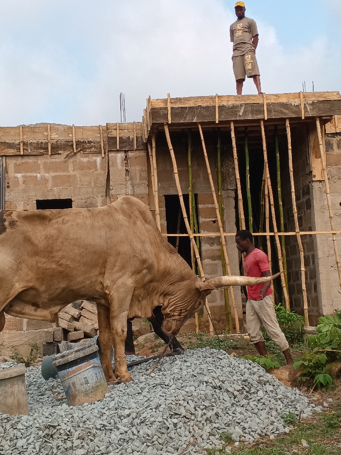 An outdoor scene in Eziudo, Nigeria, depicts an active construction site. In the upper portion of the frame, a male individual wearing a yellow cap, a grey t-shirt, and grey shorts stands atop an unfinished concrete slab supported by wooden formwork and bamboo scaffolding. Below him, the structure consists of cinder block walls with open window and door frames. In the foreground, a large, light brown zebu bull with prominent horns stands with its head lowered over a pile of grey gravel. To the right of the bull, another male individual wearing a red t-shirt and light-colored pants stands beside the gravel pile, looking towards the bull. Two plastic buckets are visible near the gravel pile. The ground also features some green foliage on the right side. The sky is partially cloudy.